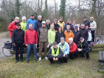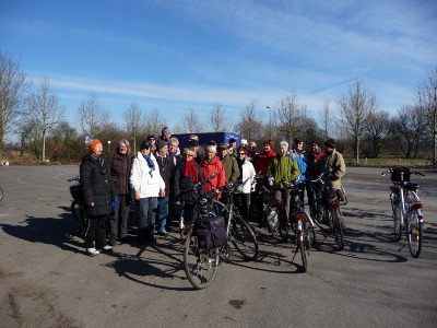Eine 30 Personen starke Gruppe eröffnete trotz fehlender Sonne die Fahrradsaison 2013 Die Gruppe radelte durch Hüls mit Stopp am Plankerdyk , dort gab es Glühwein, dann weiter durchs Hülser Bruch