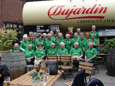 Nach dem Motto " Warum in die Ferne schweifen" führte der Familientag 28 Teilnehmer in die nähere Umgebung von "uns Hüls" . Man hoffte, dass der Himmel seine Pforten nicht öffnen würde. Ohne Tropfen führte die Tour durchs Hülser Bruch, Traar zum Elfrather See. ein paar Regentropfen wurden zur Pause mit Zwischensnack genutzt. So ließ man sich die kleinen "Appetizer" schmecken. Im Vereinsheim des Kaldenhausener Sportvereins gab es dann eine längere Mittagspause mit "Schnitzelverzehr". Gesättigt fuhr die Truppe am Uedinger Waldsee vorbei in Richtung Uerdingen mit Ziel"Dujardin". Hier besichtigte die Radsportabteilung die ehemalige Brennerei und probierte danach einen der angebotenen Weinbrände. Im Biergarten schmeckte dann noch das ein oder andere Bierchen. Nach 40 Km endete die Tour vor den Touren von Hüls mit einen dreifachen "Tret rein und einem Danke an die Organisatoren.